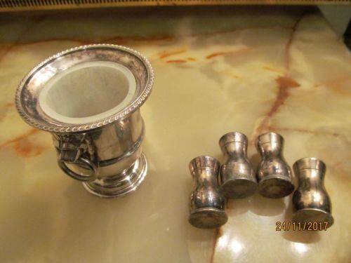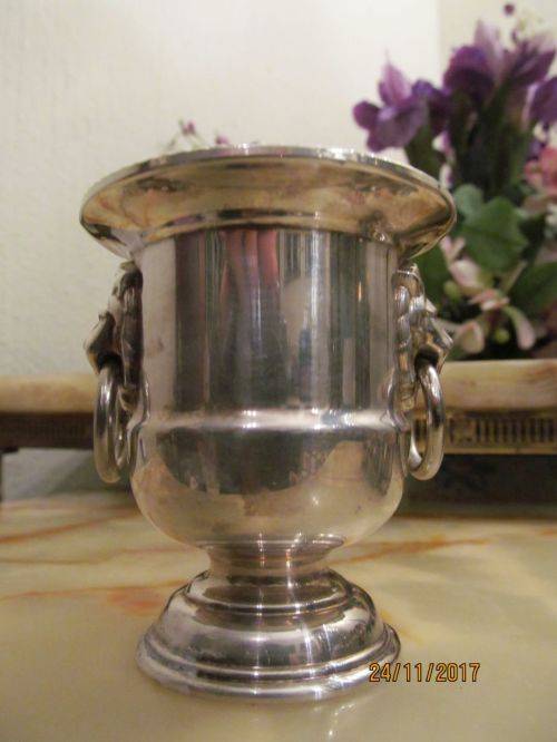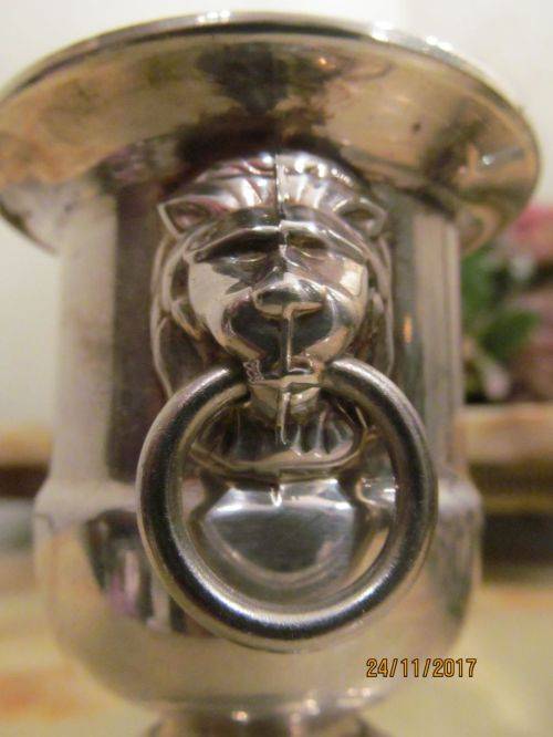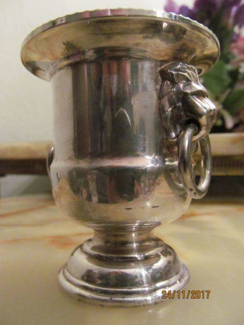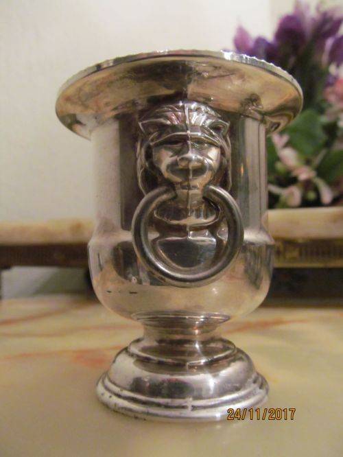 2)- A VINERS OF SHEFFIELD URN SHAPED CANDLE/TOOTHPICK HOLDER WITH WHITE MELAMINE LINER. THE ITEM HAS A RIBBED PATTERN ON THE RIM AND TWO LION HEAD HANDLES WITH RINGS. THE ITEM IS STAMPED UNDERNEATH - "VINERS OF SHEFFIELD, ENGLAND, SILVER PLATED" IT IS 7.5cm HEIGHT.....4.2cm DIAMETER OF BASE.....6.5cm DIAMETER OF RIM.....2.2cm DIAMETER OF EACH RING