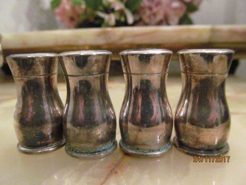 1)- TWO PAIRS OF CAPSTAN SHAPED SILVER PLATED SALT & PEPPER SHAKERS EACH IDENTICAL LOUIS PLATE SILVER PLATED BRASS WITH SCREW ON/OFF LIDS. THE ITEMS ARE STAMPED UNDERNEATH - "LOUIS PLATE SPB" EACH IS 3.7cm HEIGHT.....2.2cm DIAMETER