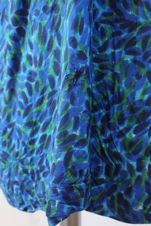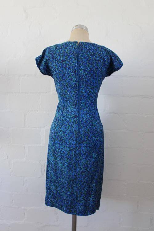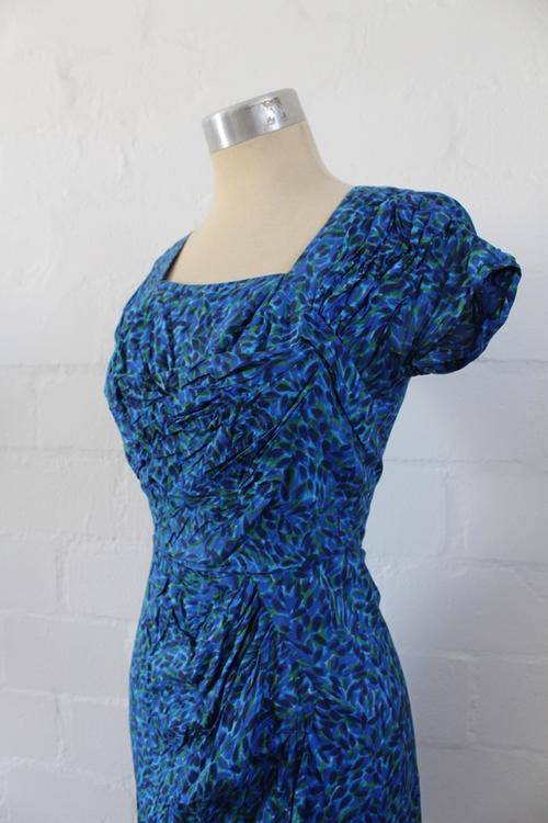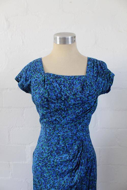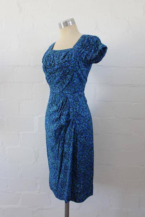 VINTAGE 100% SILK BLUE GREEN PRINTED RUCHED COCKTAIL DRESS - SIZE 8