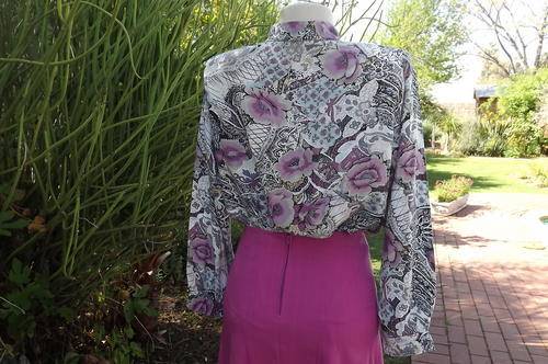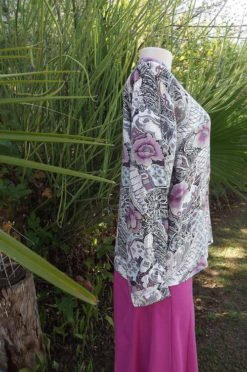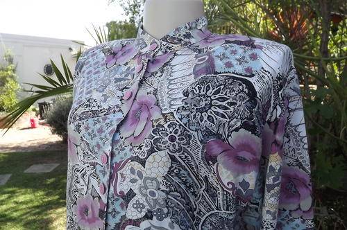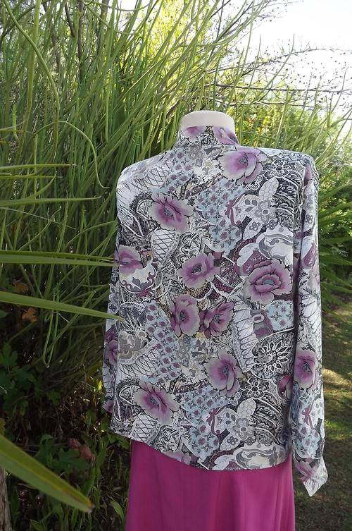 Vintage 100% viscose blouse with chinese style collar by Old Topics size 36/12.Pretty grey/blue patterns with lilac flowers.Button down front.Cuffed long sleeves.Good condition
