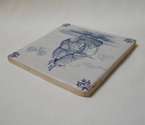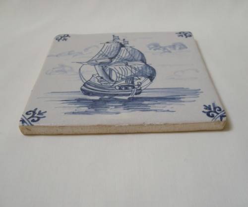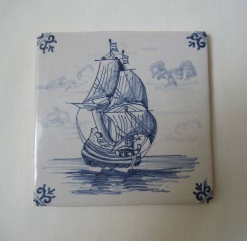 blue traditional Dutch sailing ship (carrack), and each corner with a scroll motif.