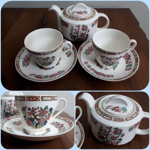 A vintage (1945-1957) Bristol China fine porcelain tea set consisting of a two-cup tea pot and two tea duos (cup and saucer). This Indian Tree Pattern tea-for- two set was manufactured by Pountney & Co between 1945 and 1957.