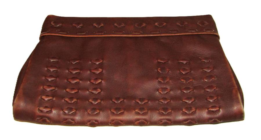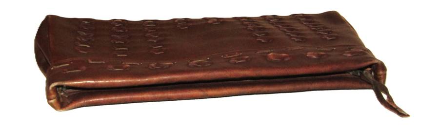 This elegant vintage clutch from the 1950s showcases timeless craftsmanship in high-quality brown leather. The exterior features unique hand-done leatherwork, with rows of intricate detailing, adding a subtle yet distinct touch of texture. The soft, supple leather has aged gracefully and is in very good vintage condition, showing some wear and signs of use that are consistent with its age.