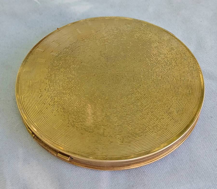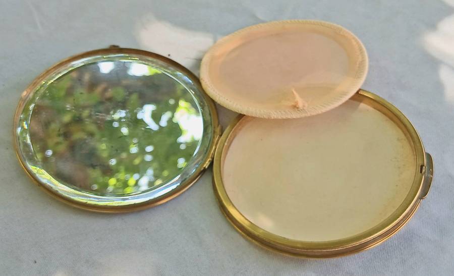 In very good vintage condition, showing some age-related wear consistent with a cherished item of its era, but no damage to the mirror or etching. While the original powder puff is missing, this compact remains a beautiful and functional collectible piece, perfect for display or use.