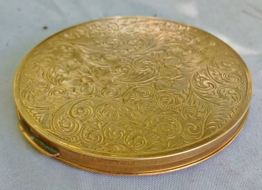 A stunning example of mid-century craftsmanship, this 1950s powder compact features a beautifully etched floral and scroll design on the lid, reminiscent of Art Nouveau elegance. The base is finely machine tooled, adding texture and sophistication, while the interior houses a round beveled mirror and the original sifter for practical use.