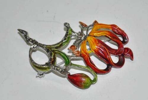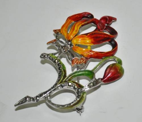 Vintage 1950s Signed BJL B Bohemian Jewellers Ltd enamel and marcasite Flame Lily brooch pin