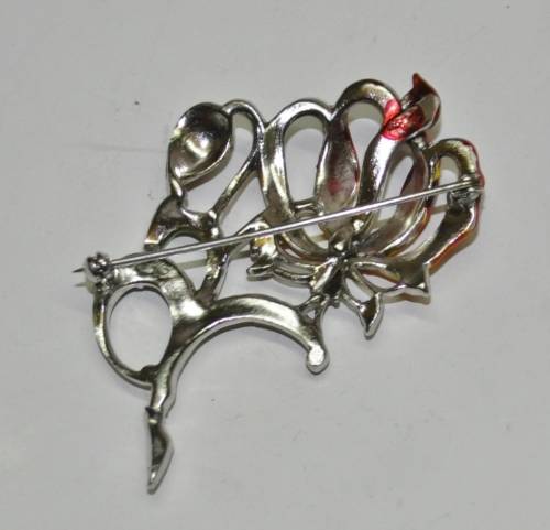 This stunning flame lily brooch is Rhodium plated and finished off with enamel and marcasite. It is signed BJL B, however the mark is almost completely worn away due to age and use. This brooch is in an excellent condition with no damage to report. It measures approximately 4 cm X 7 cm.