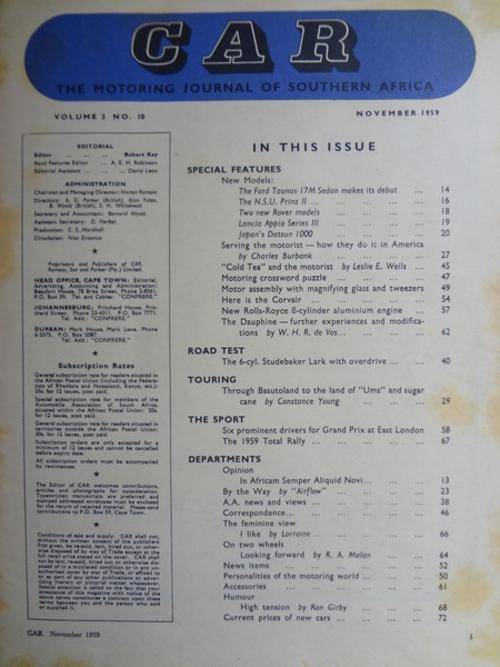 Vintage 1959 CAR the motoring journal of Southern Africa magazine - as per photo