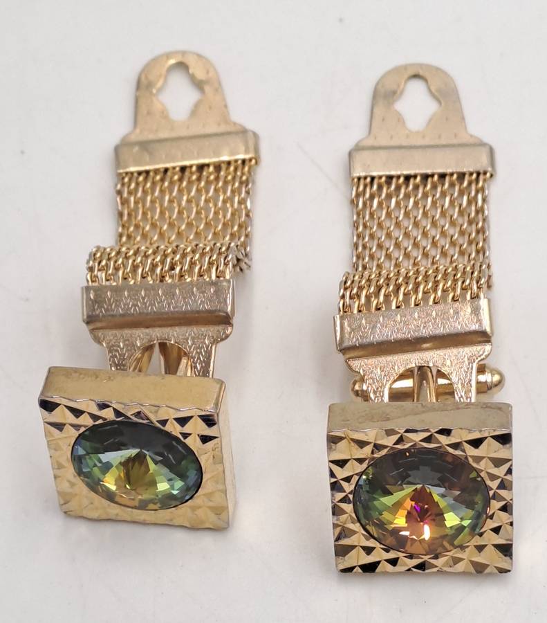 Vintage 1960s Dante Watermelon Rivioli Crystal Glass Mesh Wrap Around Cufflinks Gold Tone