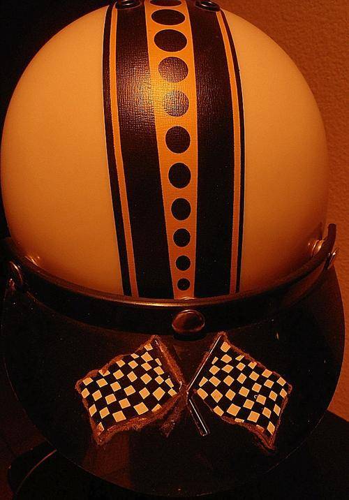Vintage 1960's racing helmet designer lamp fitted with modern cable and plug. Very decorative and unusual! Made of vintage helmet, chromed shock absorber spring and small pedal style switch. Lamp can be tilted slightly, height is approximately 45 cm.