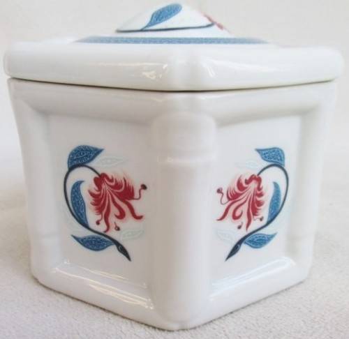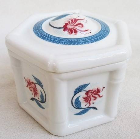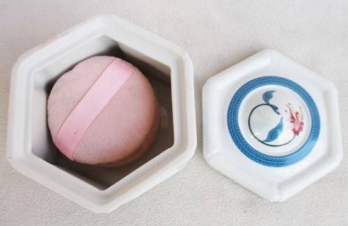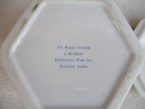 HEXAGONAL POWDER BOX 7CM TALL AND 10CM IN DIAMETER AND IN VERY GOOD CONDITION WITH NO CHIPS OR CRACKS WITH TWO POWDER PUFFS - COLLECTABLE 1978 ELIZABETH ARDEN REFER IMAGES