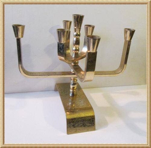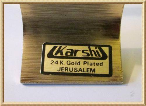 Vintage 24K Gold Plated Karshi Menorah Jerusalem, with age wear, 13cm height, 15cm width, 295g weight.