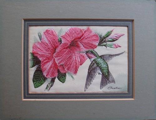 HIBISCUS WITH HUMMINGBIRD - SIZE: 17.5CM X 13.5CM (TOTAL SIZE WITH GREEN CARD OF 3.5CM IN WIDTH)