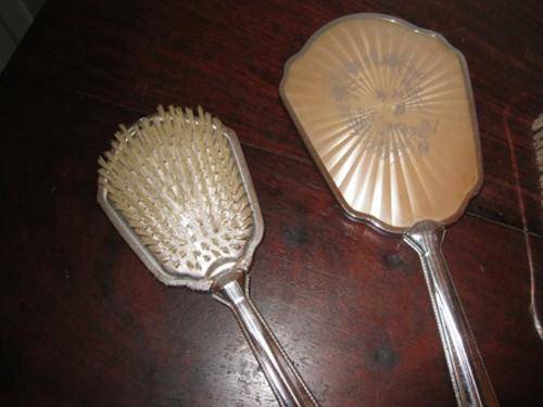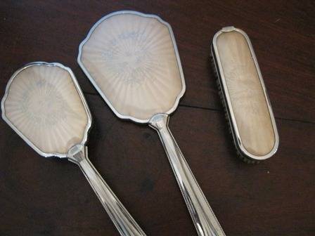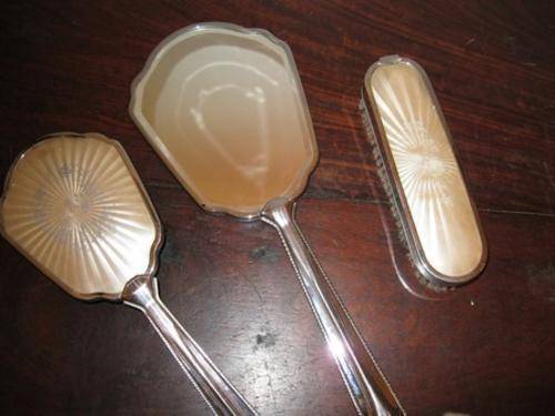 A Beautiful Three piece dressing table set consisting of a bevelled hand mirror, brush and clothes brush with a cream fluted backgound decorated with painted grey flowers absolutely stunning and in mint condition, I do not believe these items have ever been used!!