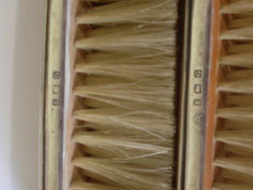 VINTAGE 4 PIECE ENAMELLED TOP HALLMARKED SILVER BRUSHES