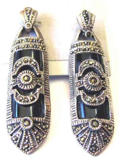 VINTAGE An unusual pair of earrings in 925 sterling silver set with black onyx approx. 22x9mm and small round marcasite marcasite . Condition: Excellent, eace is stamp on the back 925 for sterling siverDimensions: 5.00 cm long x 1.40 cm. Total weight: 16.64 grams |