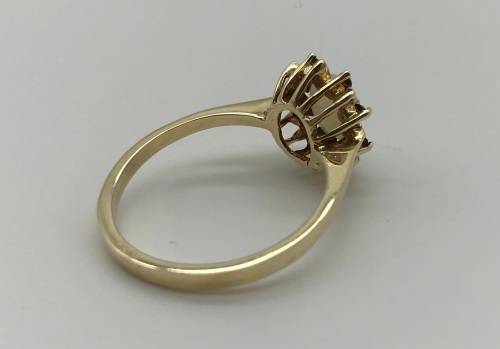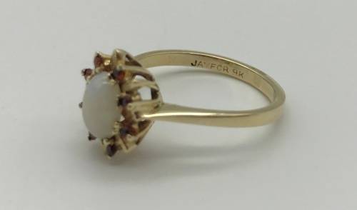 This lovely 9ct yellow gold dress ring set with 1 x oval Opal (7mmx5mm) and 8 x 1,5mm Garnets is in very good condition.