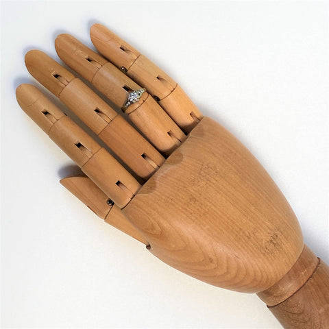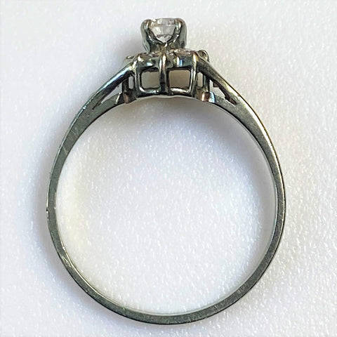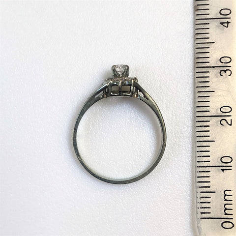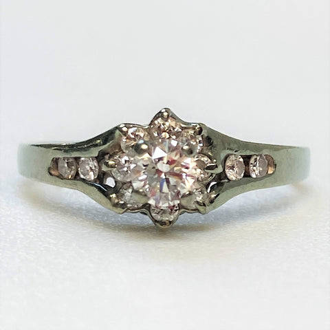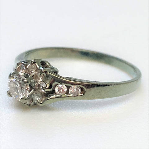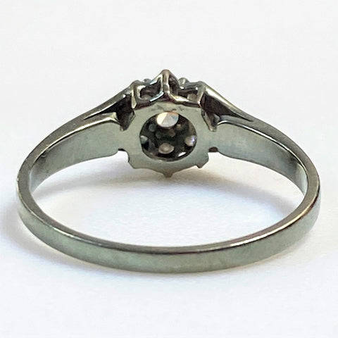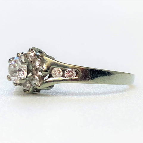 The vintage, 9ct white gold ring has a head claw-set with a circa 0.15ct diamond surrounded by eight small (circa 0.015ct each) diamonds. There are two small diamonds channel-set into each shoulder. The diamonds are all round and old-cut. The ring is marked 375 (somewhat rubbed) showing that it is made of 9ct white gold.