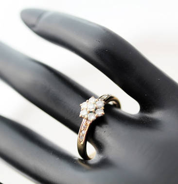 This very pretty ring is a classic example from a bygone era. The ring head is a flower design created by 7 round faceted diamonds, claw set in yellow 9ct gold. Adding to the beauty is the detailing on the shoulders of the ring in the form of three round faceted diamonds claw set flush within a groove in the shank. The effect from above is a continuous line of sparkling diamonds, emanating from the ring head. The ring's pedigree evident in the hallmarks; '375' for 9ct gold, the Birmingham assay and '0.34' for the diamond carat authentication. It would make a beautiful little engagement ring or just a pretty vintage piece of England to treasure and keep. The ring has been checked and authenticated by an independent jeweller and his certificate for R7'600 will accompany the ring, which I will send in a quality ring box.