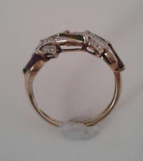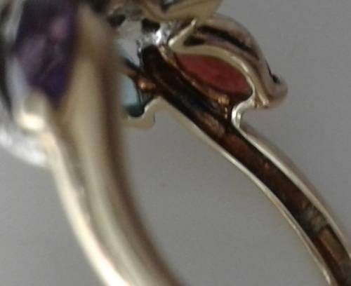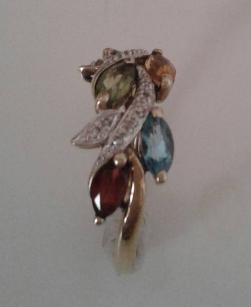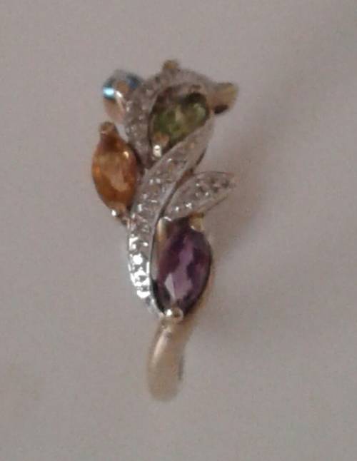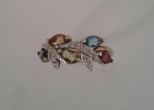 Top Width: 8mm. Weight: 2.7grams. Size: N-O. Stones are genuine. Size of gemstones: 6mm × 3mm. Blue topaz, Garnet, Peridot, Citrine and Amethyst. Diamonds set in White Gold.