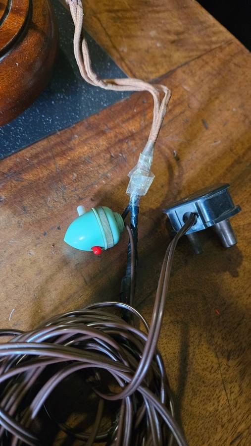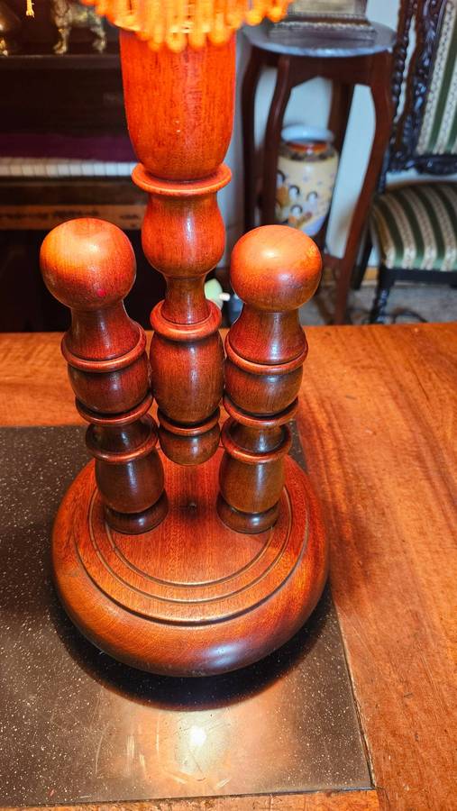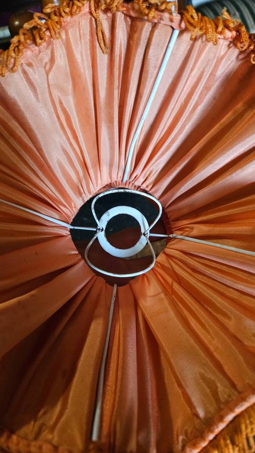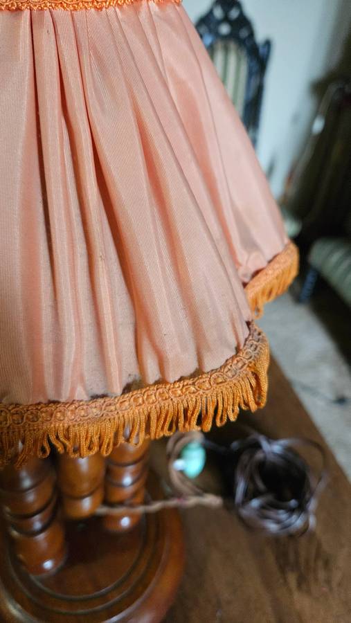 This is an old lamp and in a good condition. The wiring is old and the on/off switch is old. The lamp shade is coming loose on the edges and is slightly bent.