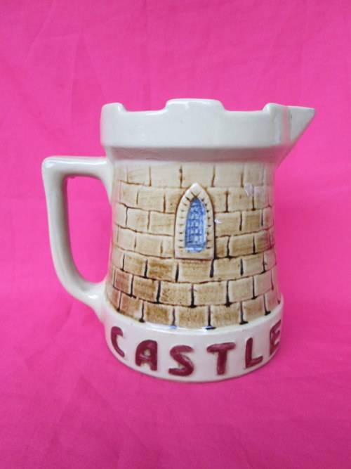 A lovely large vintage glazed pottery Castle Beer jug, in good condition, height 15.5 cm, base diameter 12.5 cm.