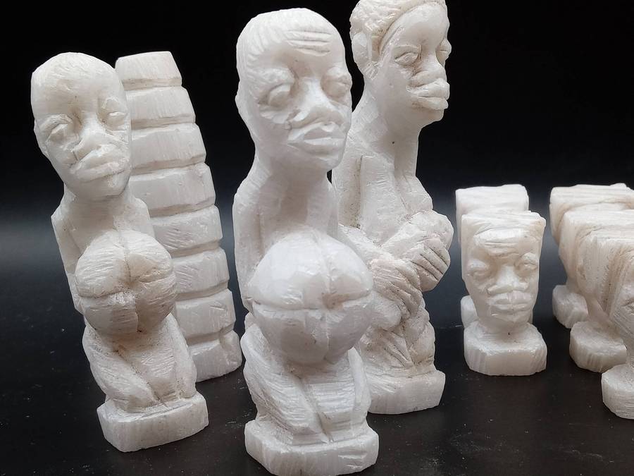 A nicely carved African (Rhodesian/Zimbabwean) soapstone chess set, dating to around the mid 20th century. Hand carved in stone featuring ethnographic figures, the set is complete