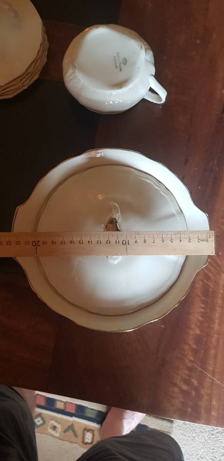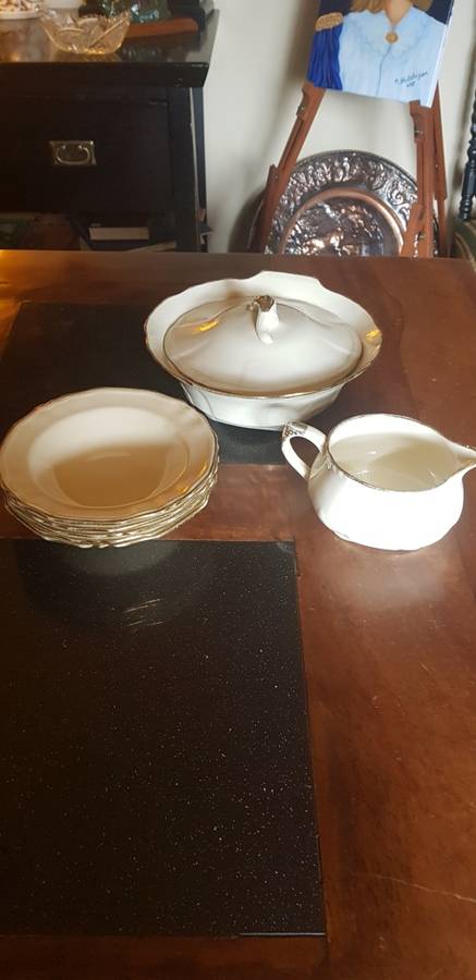 Stunning set of six soup bowls , sauce jug and a lidded soup tureen with minor losses on the gold rim... other than that, all still in a very good condition no chips. Please click on the link to view all my amazing items. All my items have the option to make an offer.https://www.bidorbuy.co.za/seller/3696399/Mr_Ooogles