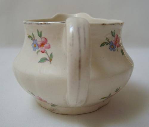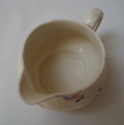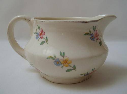 An ivory china cream jug, decorated with transfer-printed pink, yellow