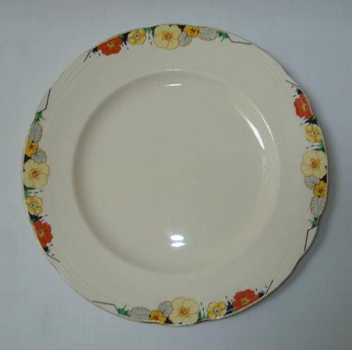 border of yellow and orange flowers and grey leaves, remnant of gilt edged rim.