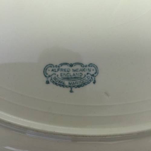 Vintage Very Elegant Alfred Meakin Green , Red and Silver Trim Serving plate. Slight usage crazing. no chips . Measures 36.5cm in diameter and 29.5cm wide