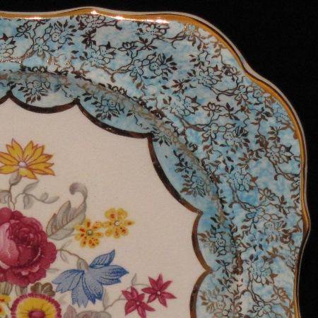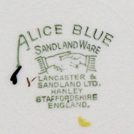 Original Vintage Alice Blue Sandland Ware Lancaster & Sandland Ltd. Hanley Staffordshire England Cake Plate dating 1940 - 1959. No Chips or Cracks. There is a fine network of crazing which is hardly noticeable thanks to the beautiful gilded pattern. Gild 99% intact.
