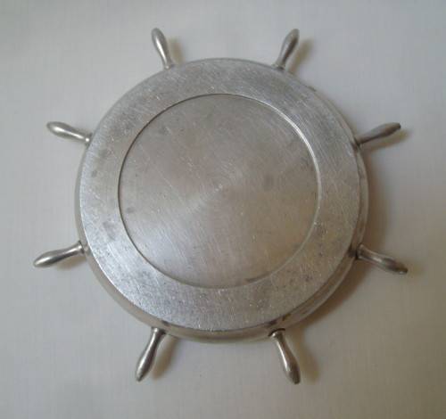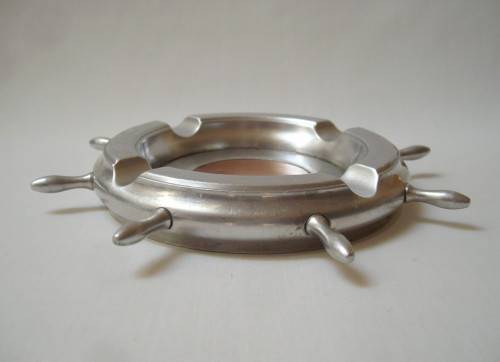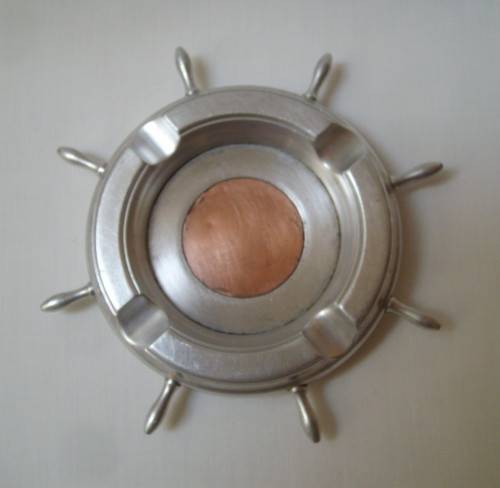 A lathe turned aluminium and copper ashtray, in the form of a ships wheel.