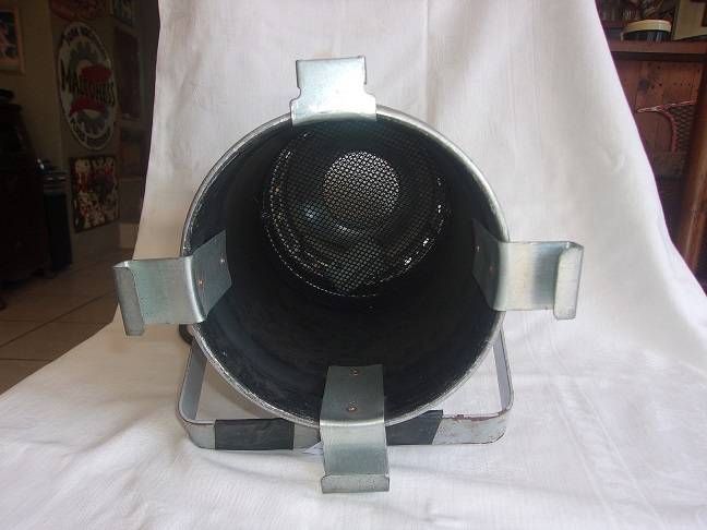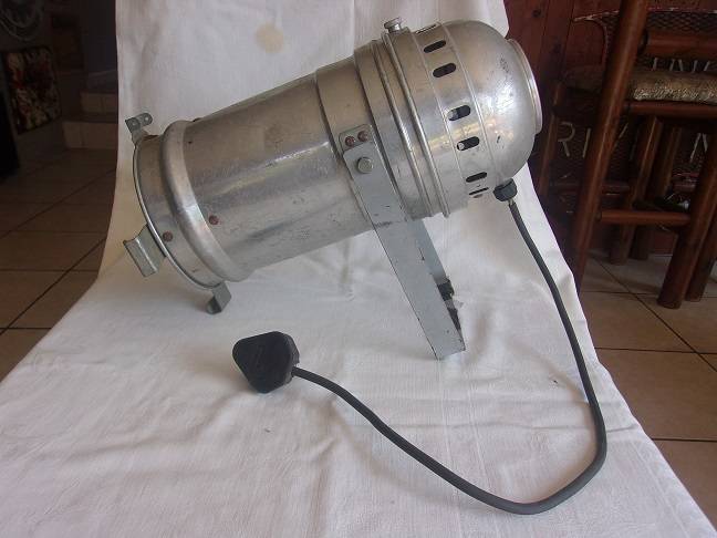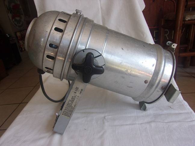 Vintage aluminum can stage light - made in Italy. I am not sure, but I think that these stage lights date to the 1970/80s. The lights are ellipsoidal in shape, and have adjustable mounts. They have 4 brackets in the front which would house different colour lenses as required on stage - 1 bracket is sprung to allow the lens to slide in (this bracket is however missing, but lens can slide into the other 3). The back of the light is removable to allow access to the globe. The light measures 38cm (L) x 17cm (diameter). Note that the bid is on the light alone, as it does not have a lens or globe - the buyer can thus choose what glass to use and what type of globe to use. Except for the missing sprung bracket, the light is in good condition. Would make a great feature in your home.