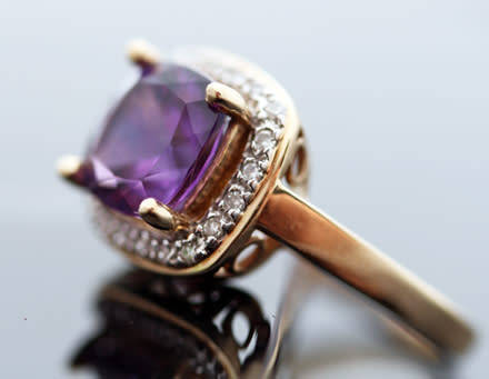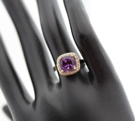 This eye-catching ring is quite spectacular on the hand! It has a particularly beautiful colour combination. I acquired this gorgeous and solid piece from a favourite vintage jeweller in England. The 8mm cushion cut amethyst is the piece's unusual feature. Measuring 10,5mm long x 10,5mm wide, the ring head also features a frame of 20 x single-cut diamonds claw set in 10ct yellow gold. The colour of the amethyst is just spectacular! The shank is a simple 10K yellow gold band, splitting vertically on the shoulders to support the bridge with scrolled openwork detail that forms the 'cage' supporting the ring head. The piece weighs a solid 3,22 grams and bears the 10K hallmark indicating 10 carat gold, the date hallmark for 2003, the jeweller original mark for 'Mexico' and the jeweller's signature. In addition, the ring was certified and hallmarked in England and also bears the Birmingham Assay mark as well as the 375 hallmark. The piece has been authenticated and valued by an independent jeweller at R18,000 and a certificate to that effect will accompany the piece. A gorgeous ring - a real conversation-piece!