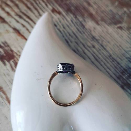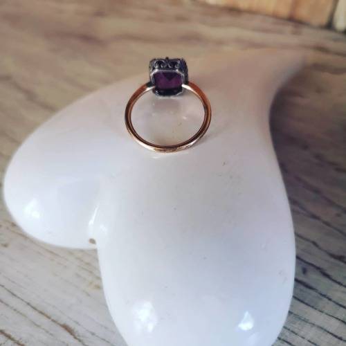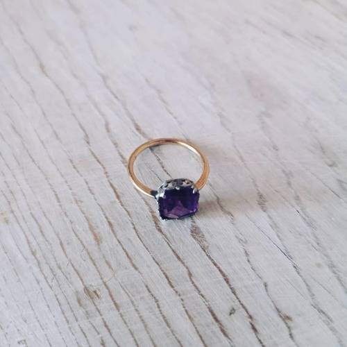 This unusually beautiful little ring has its band cast in gold and its filigree setting with Amethyst stone is cast in silver.