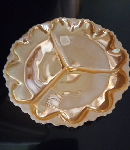 Vintage 1950s Anchor Hocking Fire King Peach Lustre Divider also known as The Dusty Mermaid is a rare and beautiful item to have in your collection. In perfect condition. It's a 3 section server to delight those special guests..
