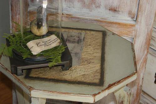 This is a beautiful muted green colour which I mixed with plaster of paris in powdered form. I distressed the table in all places where it would naturally become worn over time. I transferred an image of a mysterious beauty.I framed her with a graphic of a wonderful poem entitled "Night" that is done in the loveliest penmanship handwriting. I then used some burnt umber to darken the edges using a moist cloth to blend it in and give it an uneven edge. Finally I used some wood stain in Mahogany and rubbed this all over to create that antiqued effect......Voila!