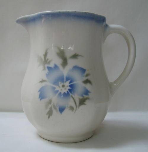 an under-glaze air-brushed, stenciled blue flower and green leaves.