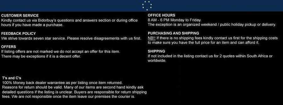 R65.00 Standard shipping applies to orders under R100.00, in most areas in South Africa. R35.00 Standard shipping applies to orders over R100.00. Some areas may attract a surcharge surcharge. This will be calculated at checkout if applicable. Check my rate