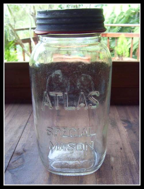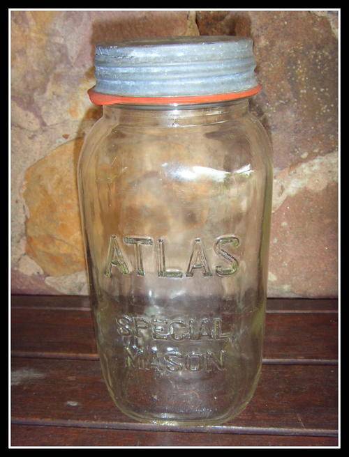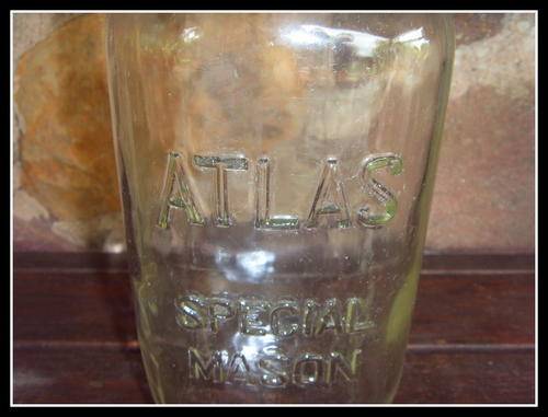 This is a vintage clear 'Atlas' Mason jar for canning. This jar is a 'Special Mason' and still has the