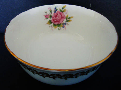 THE BOWL FEATURES A PINK ROSE PATTERN ON A WHITE BACKGROUND WITH GOLD TRIM.