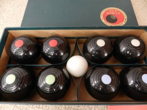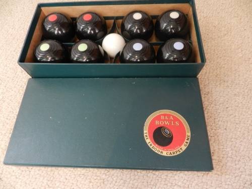Vintage B&A Carpet Bowls in box complete with rules. Consists of: Original box. 8x miniature carpet bowls.