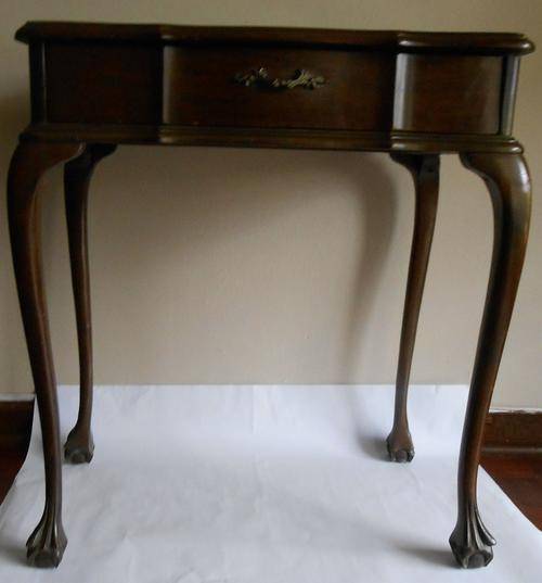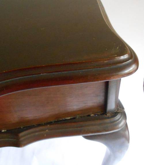 Might needs a bit of restoration, crack on left back leg. Structurally the table is stable, the leg is not shacking