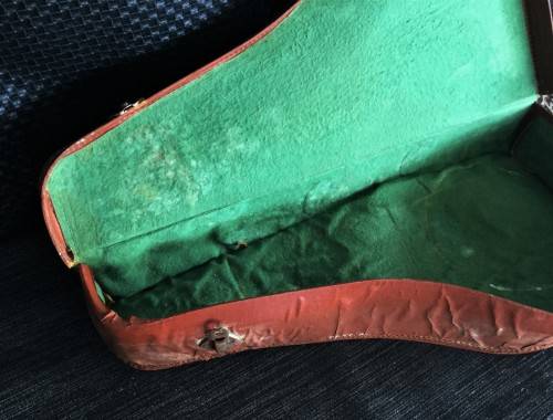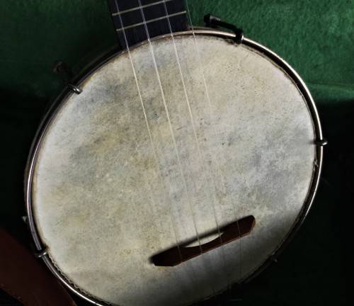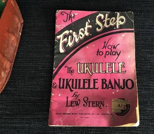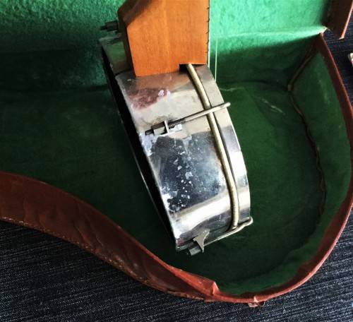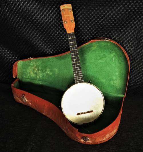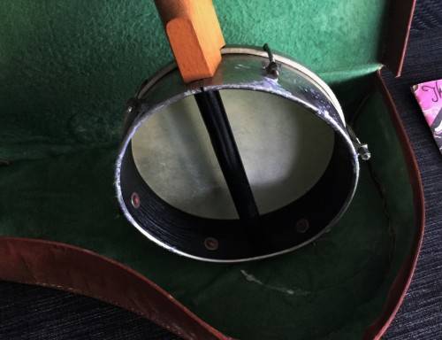 Hi there, I have this great vintage banjo in a leather case. The banjo has a great steel drum with a drum material wrapped around it for maximum sound quality. The case also comes with a vintage instruction book for a ukulele, a similar instrument. Unfortunately the bottom of the case does have some wear and water damage. The case has a length of 60cm. Please only serious bidders, secure door to door courier is R150, Good Luck!