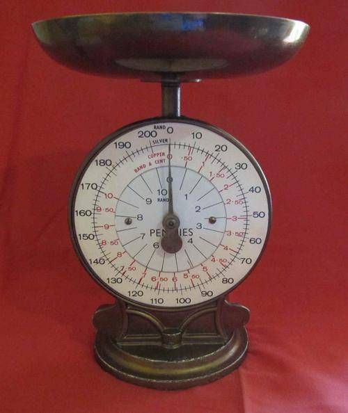 Vintage Banker's Coin Scale marked in Pennies, Silver Rand and Rand and Cent. In working order. The scale tray is made of brass, the body bronze. Lovely collectors item and conversation piece. These scales were used by all the major banking institutions during the 1960's.