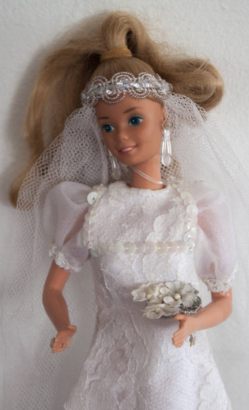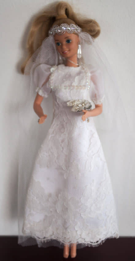 30cm tall and in very good condition, wearing a wedding dress, with earrings, ring and Pendant