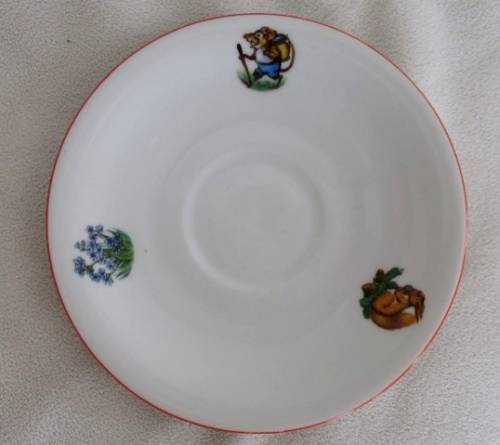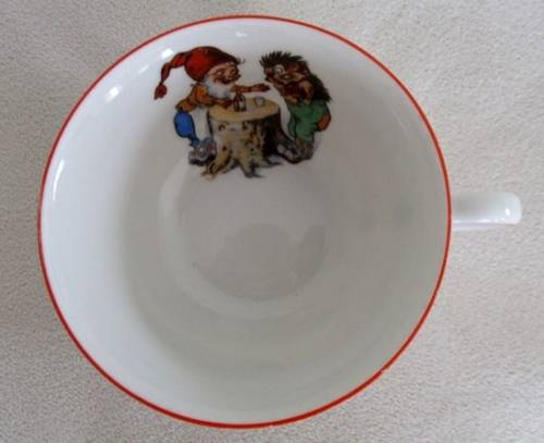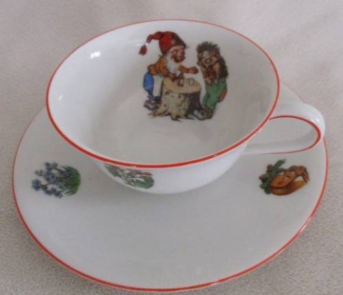 BEAUTIFUL CUP AND SAUCER DEPICTING DWARF, HEDGEHOG AND OTHER FOREST ANIMALS IN VERY GOOD CONDITION WITH NO CHIPS OR CRACKS. CUP IS 4.5CM TALL WITH TOP DIAMETER OF 8.5CM AND SAUCER IS 13.5CM IN DIAMETER. REFER IMAGES