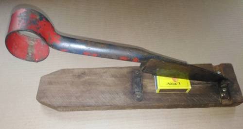 The biltong slicer is handmade using wood and one blade of a pair of sheep searing scissors. The condition is as per the photographs.