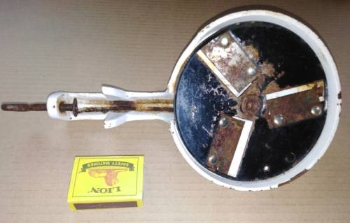 The front of the bean slicer has a few rust spots but is in a fair condition considering its age. The sling still rotates smoothly. All the blades are intact but there is a quite a bit of rust at the back.
